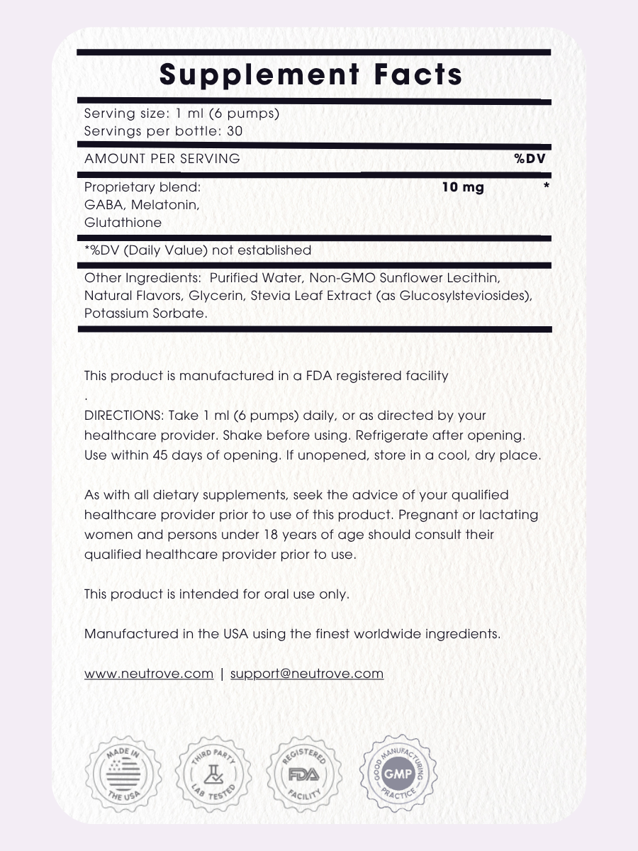 Sleep is a multi-layered process. GABA calms the nervous system, Melatonin signals the body to fall asleep, and Glutathione supports the cellular repair that happens while you rest. Together, they provide a comprehensive solution for deeper and more restorative sleep.